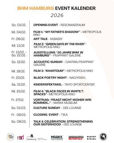 https://www.instagram.com/blackhistorymonth_hamburg/ Aktuelle Ändernungen entnehmt ihr bitte der oben genannten Instagramseite Gefördert durch freie und Hansestadt Hamburg, Behörde für Kultur und Medien